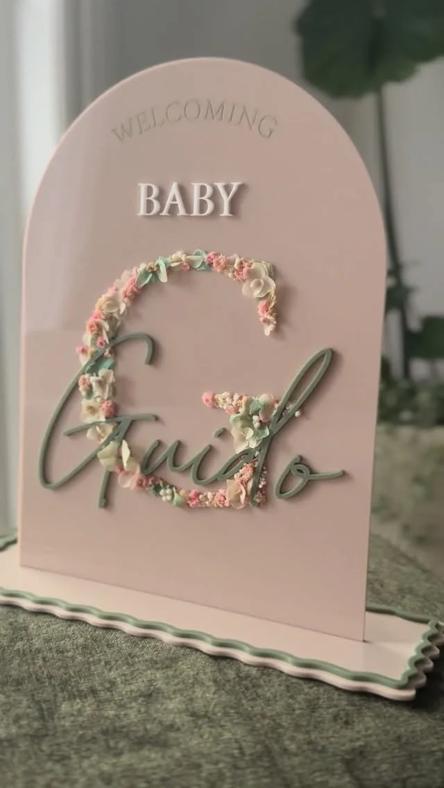 This beautifully crafted 30cm arch plaque features delicately hand-placed preserved florals, creating a soft, elegant statement piece for nurseries, baby showers, or birth announcements. Each floral arrangement is uniquely designed, making every piece one of a kind.